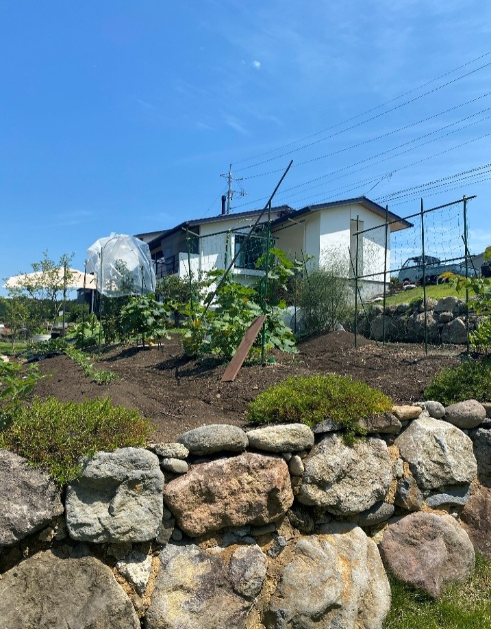 傾斜地に大きな石で囲んで造った家庭菜園