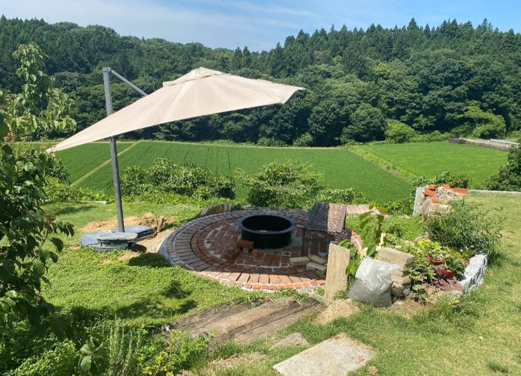 床にレンガを敷いた手造りのBBQスペース